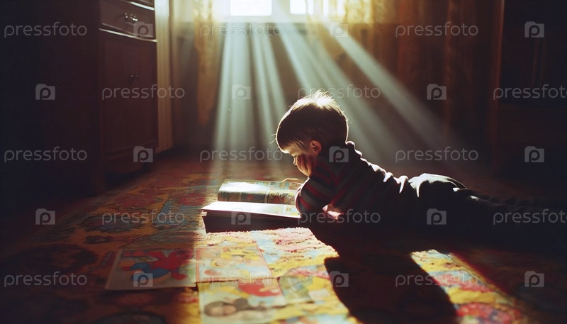 Ребенок, полностью погруженный в чтение комикса на полу гостиной с лучами солнца, освещающими его и страницы, создал изображение Ai
