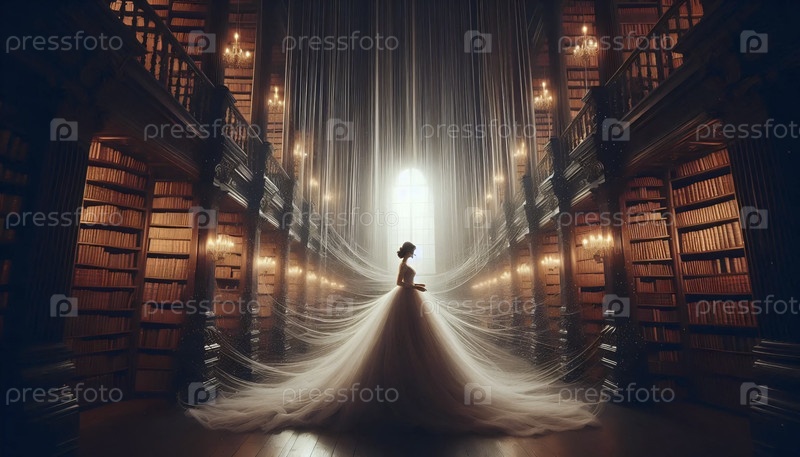 Невеста, висящая в воздухе сотнями невидимых нитей в большой библиотеке, Ai generated image