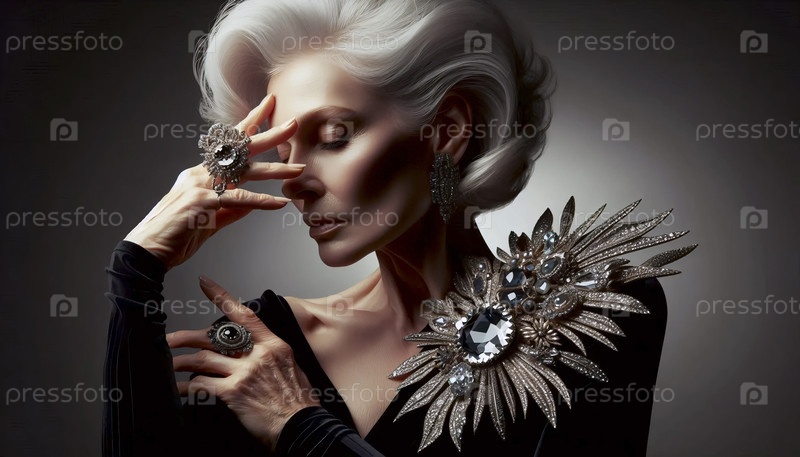 Общественная дама с чудовищно большой брошюрой из драгоценных камней, ее рука драматически покрывает один глаз, Ai generated image