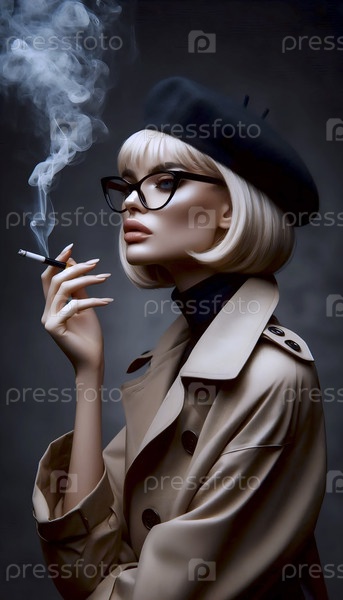 Модель в куртке и берете, держащая сигарету на длинном носителе, дым, изгибающийся вверх, Ai generated image