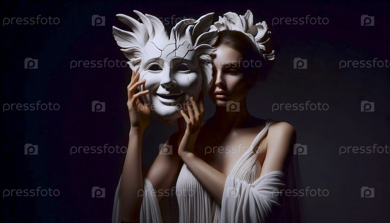 Танцовщица в платье греческого стиля, держащая большую треснувшуюся классическую маску над собственным лицом, Ай создала изображение
