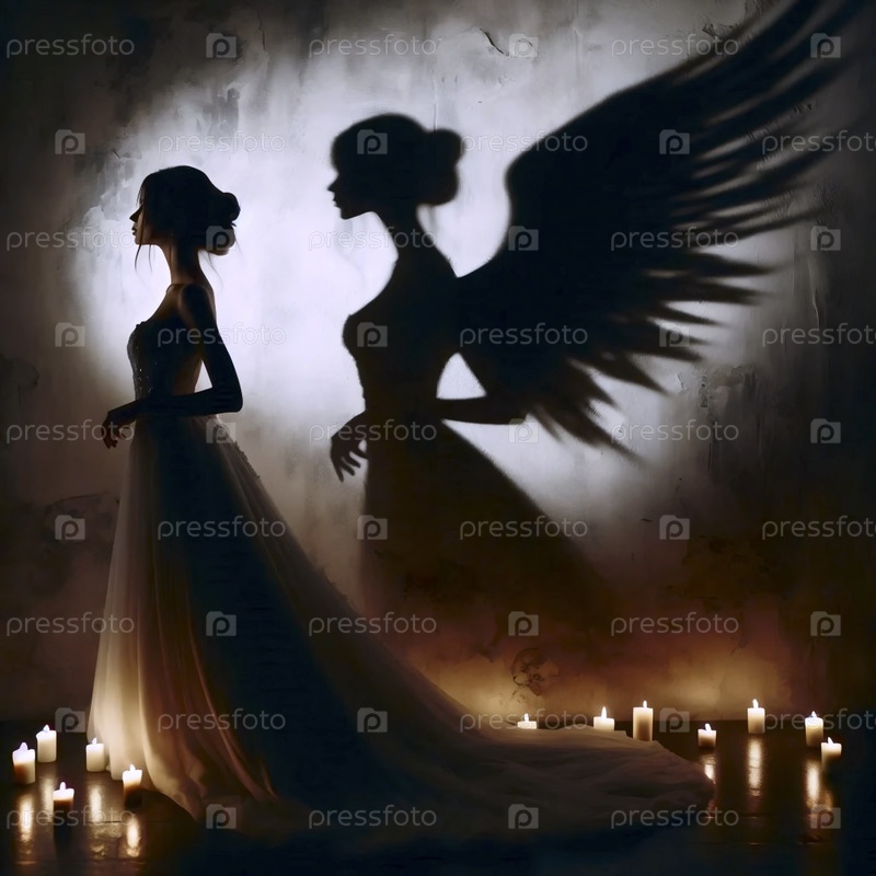 Тень невесты, брошенная свечой, превращается в чудовищно элегантную форму на стене, Ai generated image