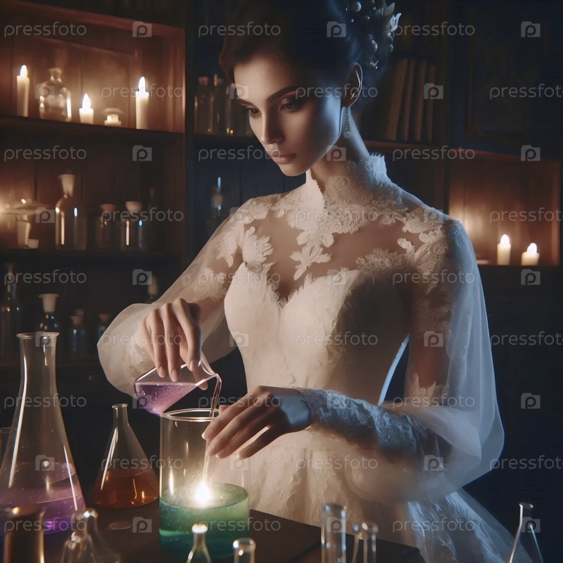 Невеста в стерильном лабораторном пальто над ожерелье платье, создавая светящийся зелье в стакане, Ai generated image