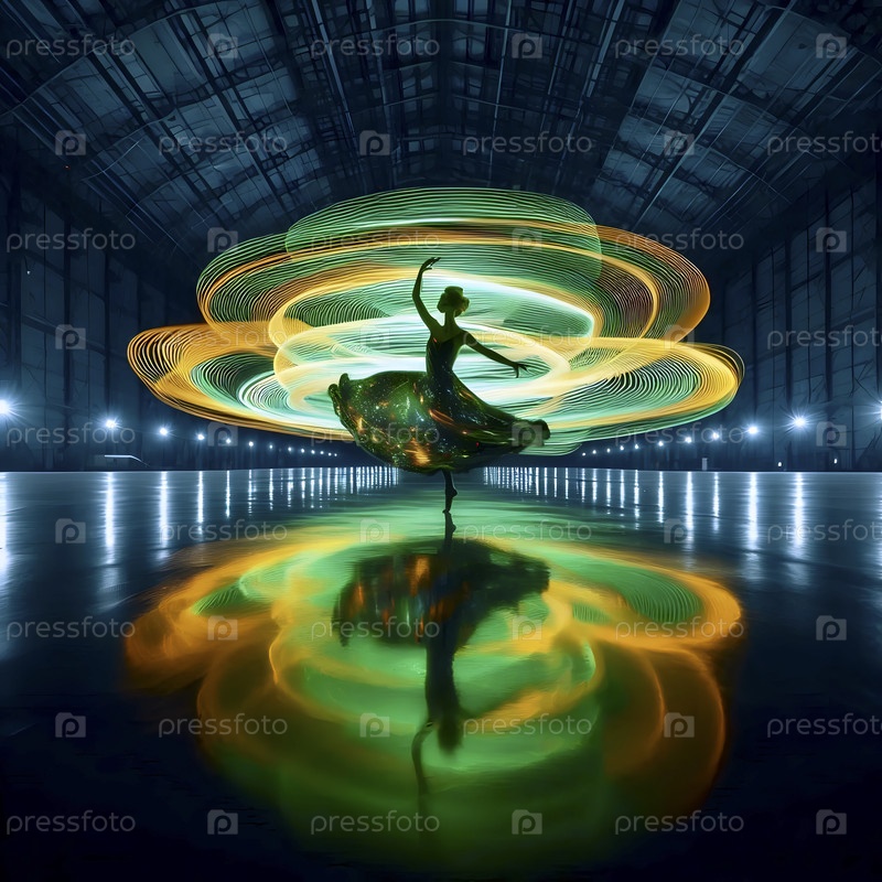 Танцовщица, покрытая фосфоресцентной краской, вращается в черно-черном ангаре, световые следы, Ai generated image