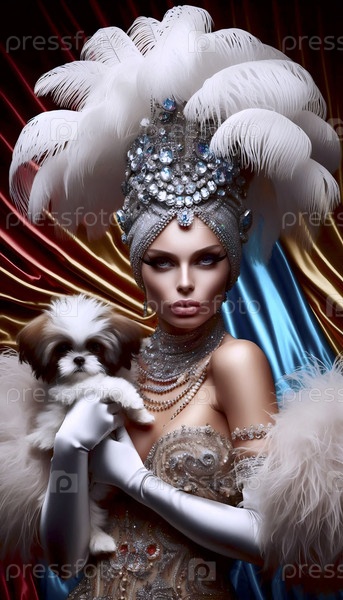 Эксцентричная наследница в страусовом оперении и тюрбане, держащая маленькую собаку, выглядящую жестоко, создала образ Ай