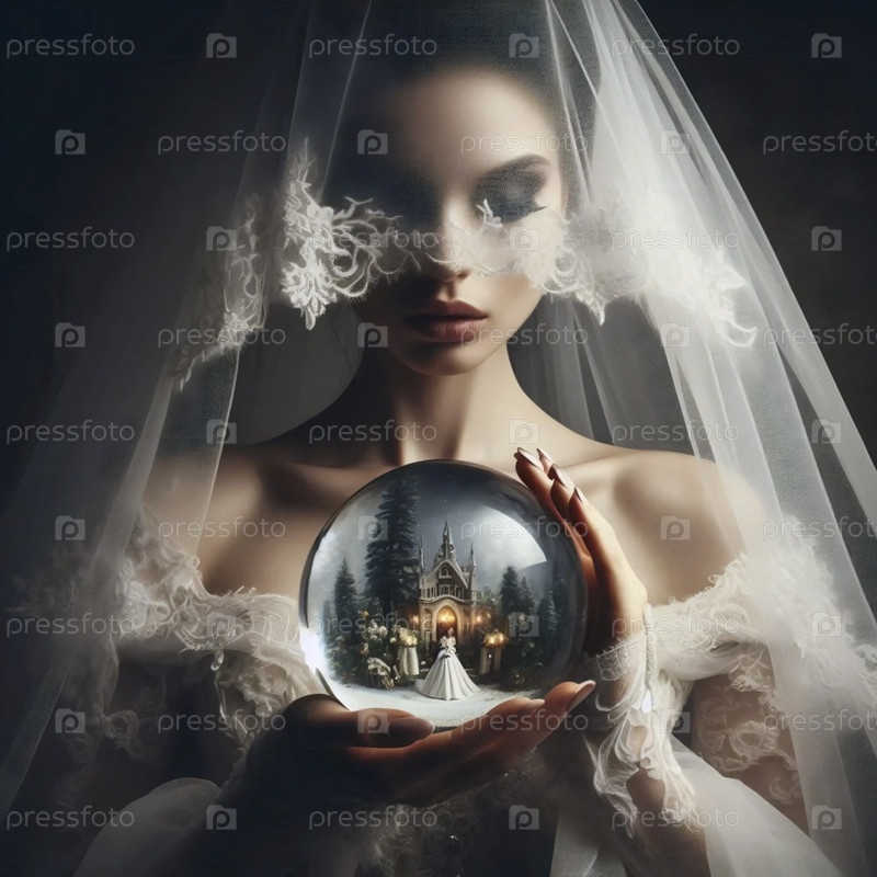 Невеста в виде замаскированного оракула, лицо скрытое, держащая туманный кристаллический шар с крошечной сценой внутри, Ай создала изображение