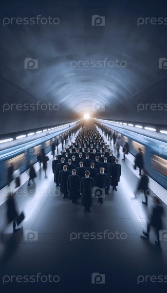 Тихий хор выступает на оживленной, холодно-синей станции метро в часы пик, Ai generated image