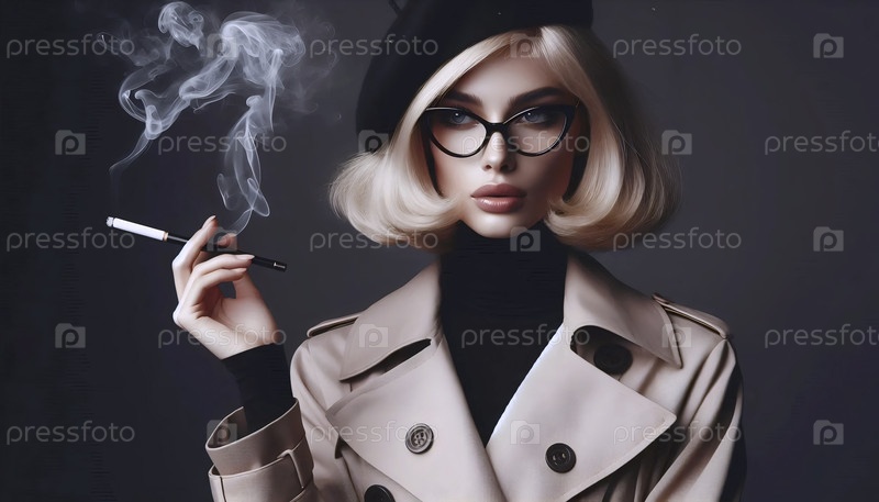 Модель в куртке и берете, держащая сигарету на длинном носителе, дым, изгибающийся вверх, Ai generated image