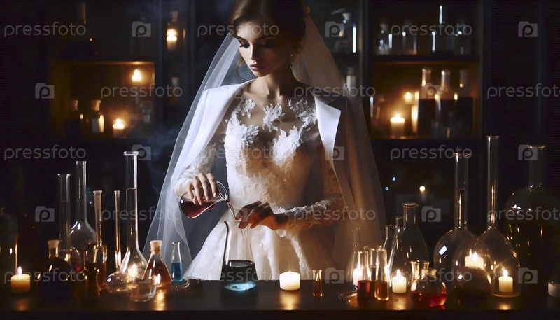 Невеста в стерильном лабораторном пальто над ожерелье платье, создавая светящийся зелье в стакане, Ai generated image