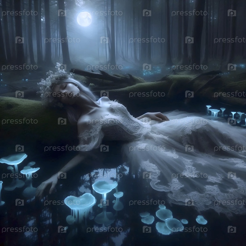 Невеста плавает в лунном лесоисточнике, окруженной светящимися биолюминесцентными грибами, Ai generated image