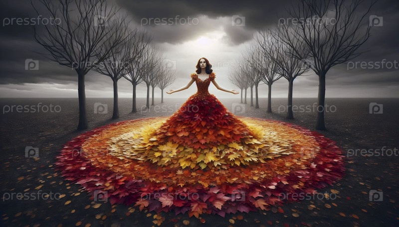 Невеста в одежде из осенних листьев стоит вокруг мертвых деревьев, Ai generated image