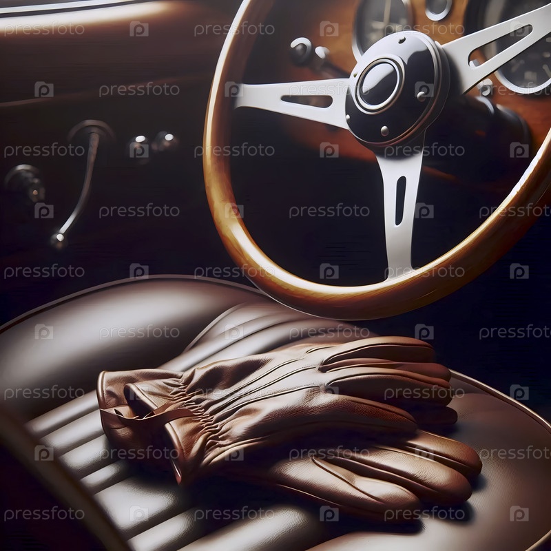 Пара кожаных водительских перчаток, обтянутых над рулем старого спортивного автомобиля, Ai generated image