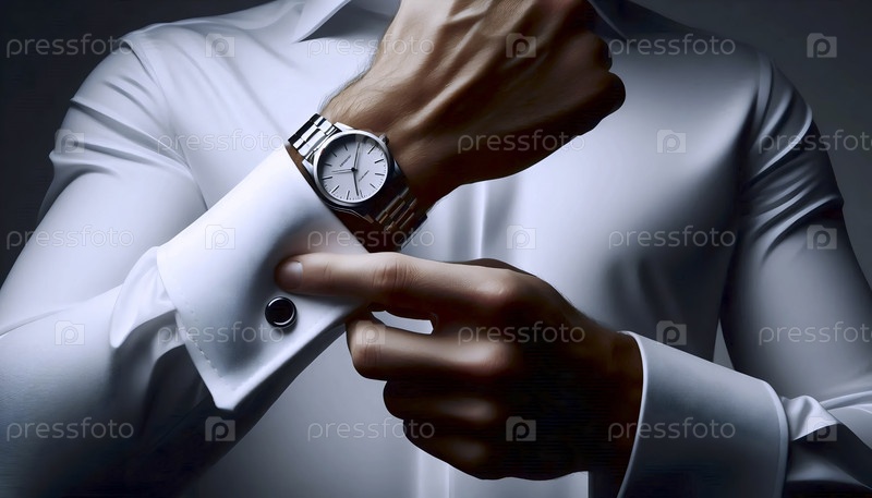 Ближайшее изображение часов на запястье мужчины, когда он регулирует кнопку наручников хрустящей белой рубашки, Ai generated image