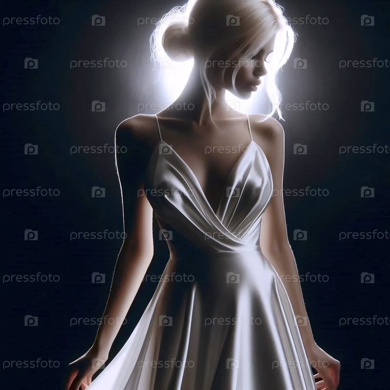 Голливудская звезда в белом атласе, освещенном на черном фоне, один ремень падает с ее плеча, Ai создал изображение
