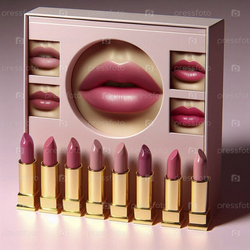 Линейка труб для помады в различных оттенках розового цвета, с ртом модели в центре носящей один оттенок, Ai создала изображение