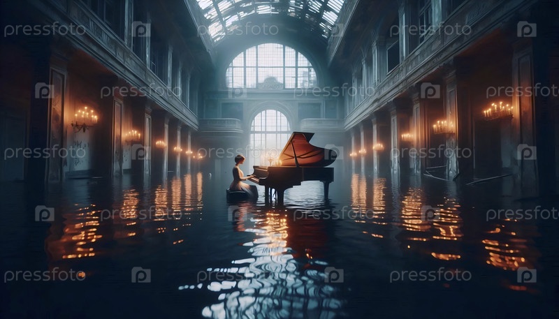 Музыкант, играющий на пианино, который наполовину погружен в затопленный бал-зал с украшениями, Ai generated image