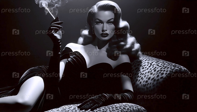 Смертельная женщина 1940-х годов в черном бархатном платье, прислонившись к дивану с принтом леопарда, Ai generated image