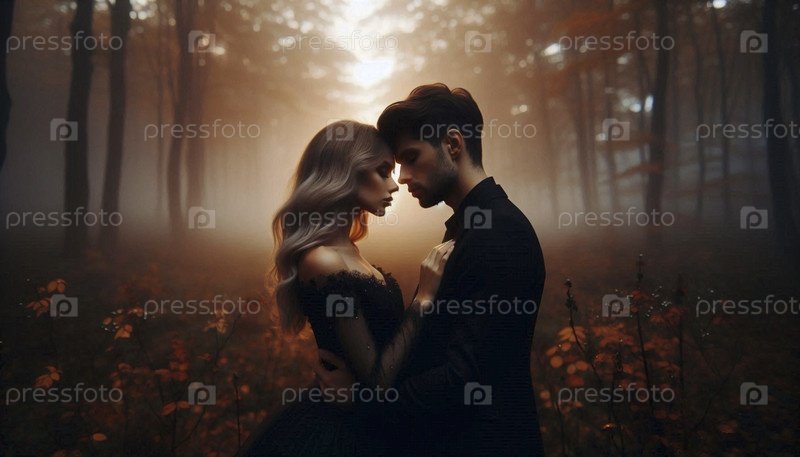 Невеста и жених делятся дыханием, их лбы касаются друг друга в туманной лесной равнине, Ai generated image