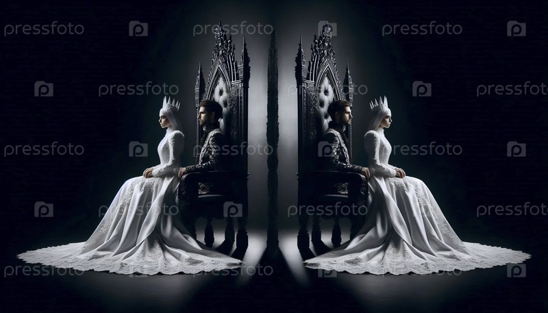 Невеста и жених как симметричные монархи на тронах-близнецах, спиной к спине, смотря в противоположных направлениях, Ai создал изображение