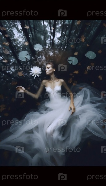 Невеста лежит погружена в лесной пруд, ее белое платье цветет вокруг нее как водный лилия, Ai generated image