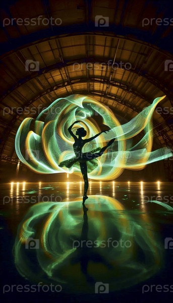 Танцовщица, покрытая фосфоресцентной краской, вращается в черно-черном ангаре, световые следы, Ai generated image