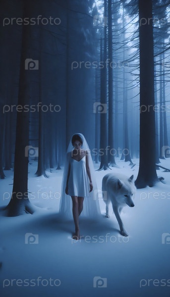 Невеста гуляет с призрачным белым волком через заснеженный, мертвый лес в сумерках, Ai generated image