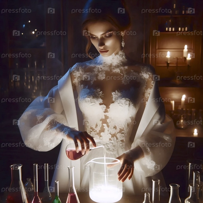 Невеста в стерильном лабораторном пальто над ожерелье платье, создавая светящийся зелье в стакане, Ai generated image