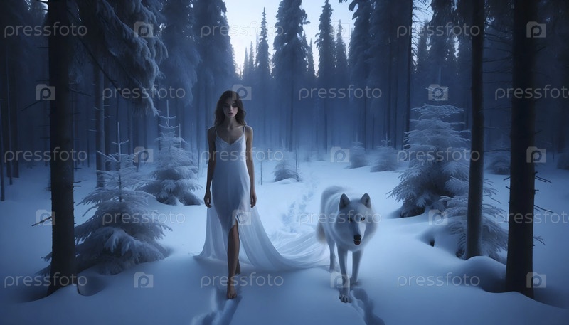 Невеста гуляет с призрачным белым волком через заснеженный, мертвый лес в сумерках, Ai generated image