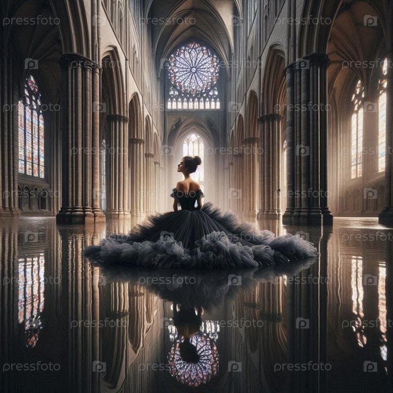 Невеста в черном тульском платье встает на колени в затопленном соборе, Ai generated image