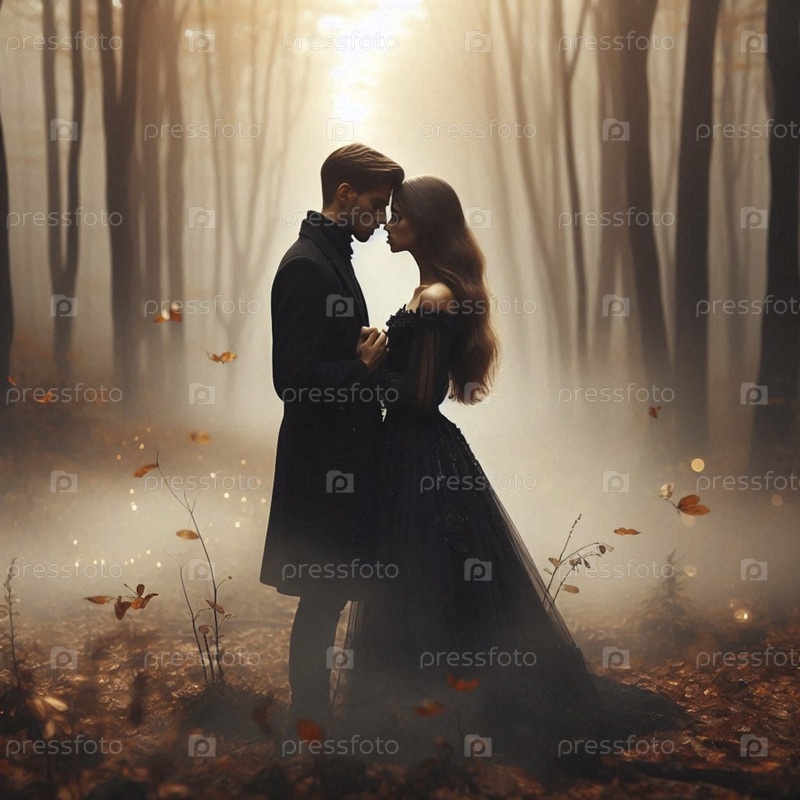 Невеста и жених делятся дыханием, их лбы касаются друг друга в туманной лесной равнине, Ai generated image