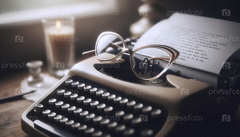 Пара очков для кошачьих глаз, опираясь на открытую пишущую машинку с листом бумаги, содержащей стихотворение, Ай создала изображение