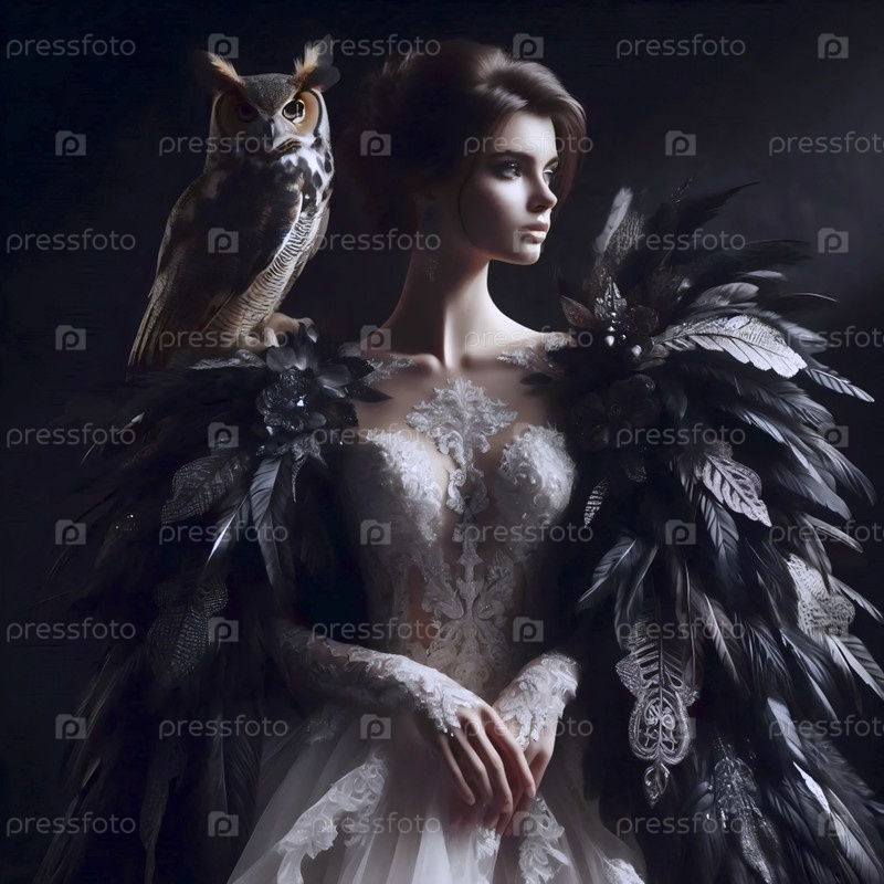 Невеста в пернатом плаще с большой рогатой совой, сидящей на ее плече, Ай создала изображение