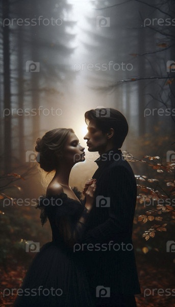 Невеста и жених делятся дыханием, их лбы касаются друг друга в туманной лесной равнине, Ai generated image