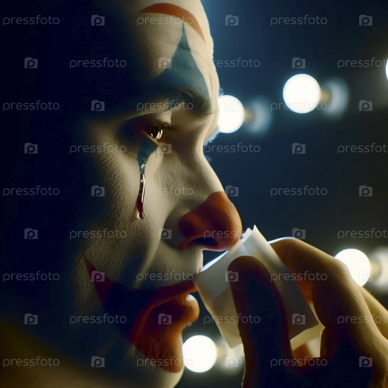 Клоун снимает макияж под жесткой лампочкой, слезы перерезают смазочную краску, Ai generated image