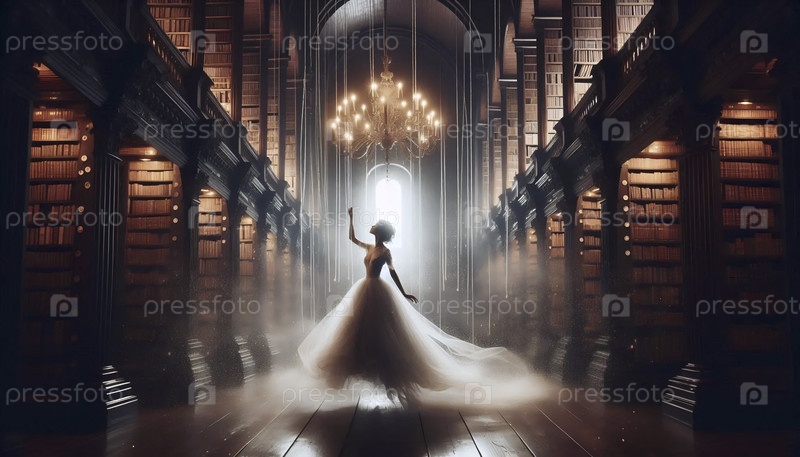 Невеста, висящая в воздухе сотнями невидимых нитей в большой библиотеке, Ai generated image