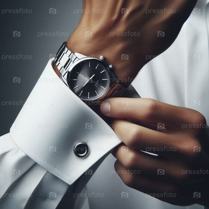 Ближайшее изображение часов на запястье мужчины, когда он регулирует кнопку наручников хрустящей белой рубашки, Ai generated image