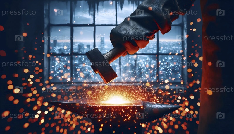 Руки кузнеца ковают лезвие, искры летают против темного окна с видом на город, Ai generated image