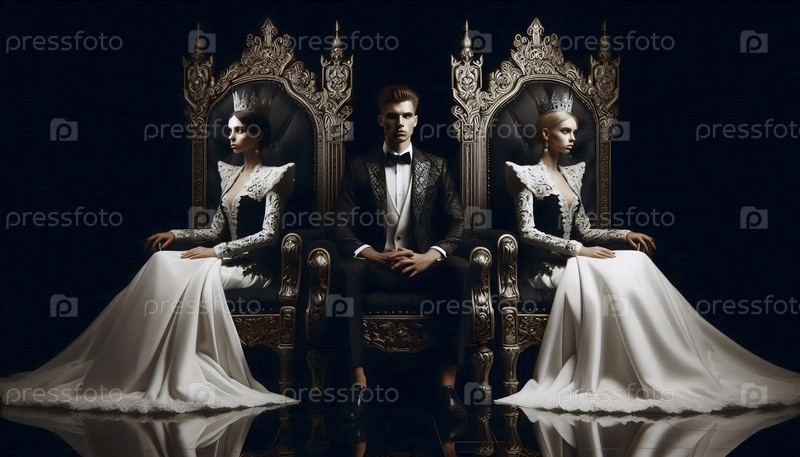 Невеста и жених как симметричные монархи на тронах-близнецах, спиной к спине, смотря в противоположных направлениях, Ai создал изображение