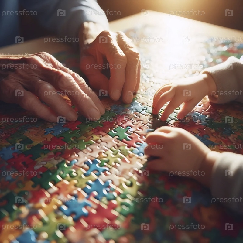 Клубовый снимок старых и молодых людей, работающих вместе над созданием головоломки на кухонном столе