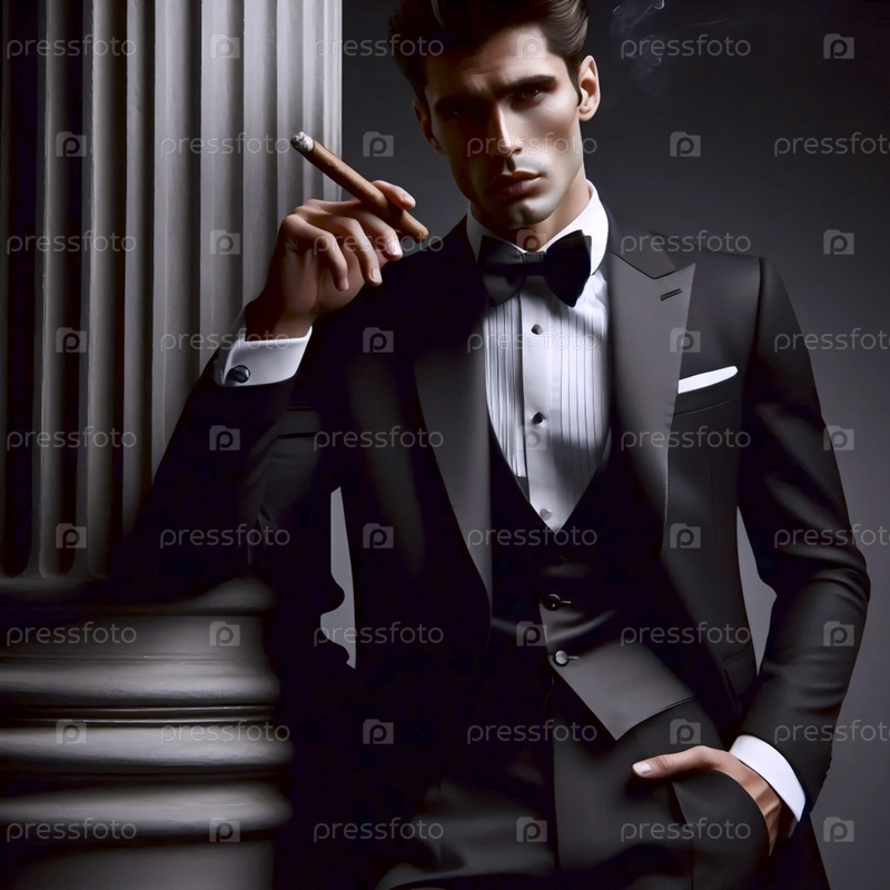 Харизматичный актер в индивидуальном смокинге, опирающийся на столб с одной рукой в кармане, Ай создал образ