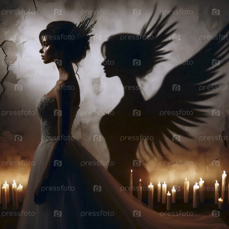 Тень невесты, брошенная свечой, превращается в чудовищно элегантную форму на стене, Ai generated image