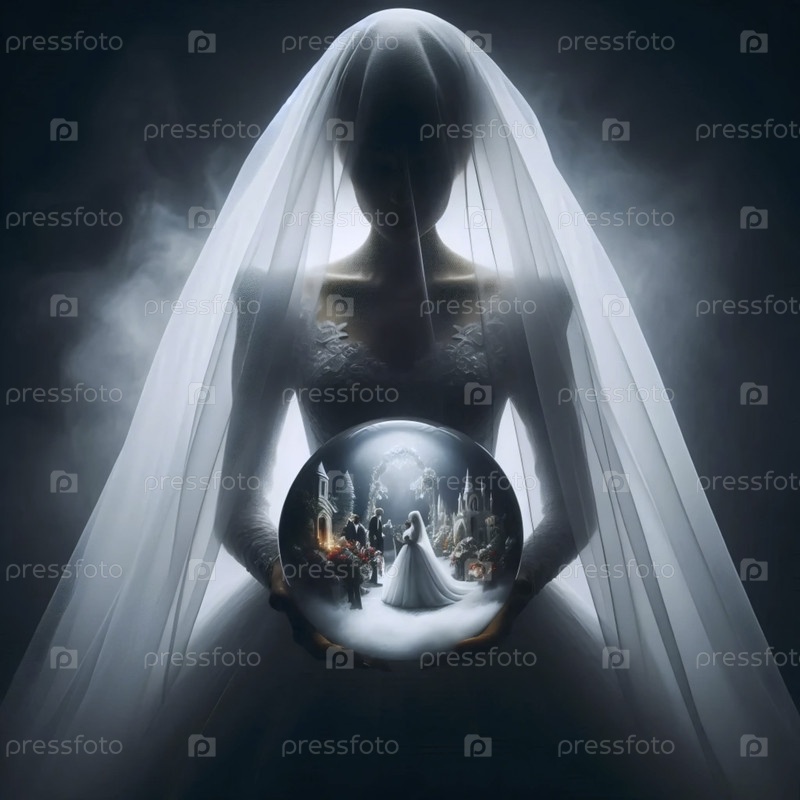 Невеста в виде замаскированного оракула, лицо скрытое, держащая туманный кристаллический шар с крошечной сценой внутри, Ай создала изображение