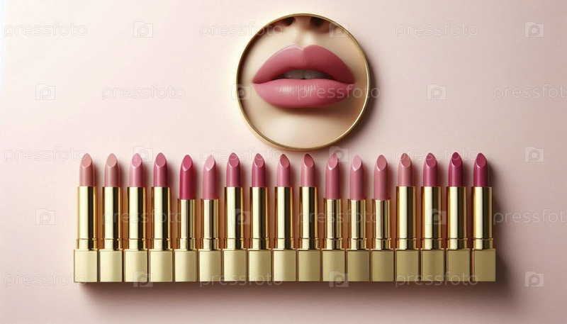 Линейка труб для помады в различных оттенках розового цвета, с ртом модели в центре носящей один оттенок, Ai создала изображение