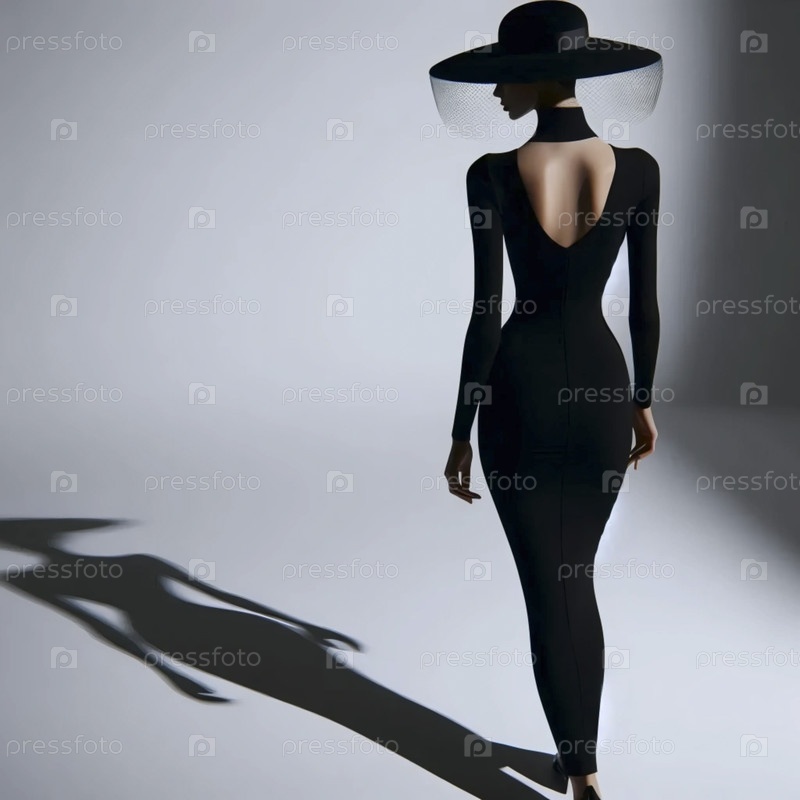 Женщина сзади, одетая в драматическую черную шляпу-пиллебокс со зонтиком на лице, уходит, Ai generated image