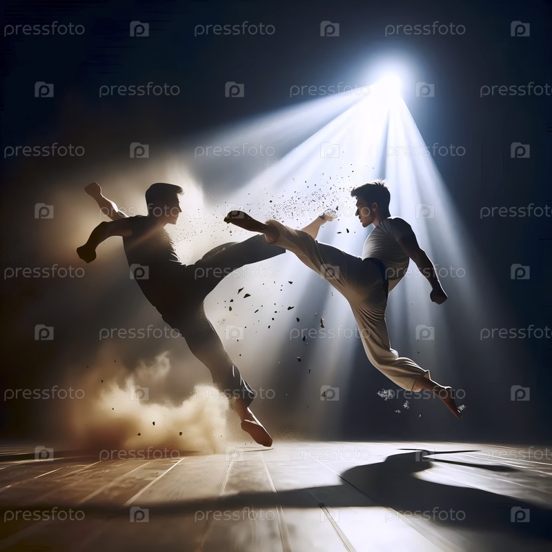 Репетиция боевой хореографии, захваченная в момент удара, пыли и летающих осколков, Ai создала изображение