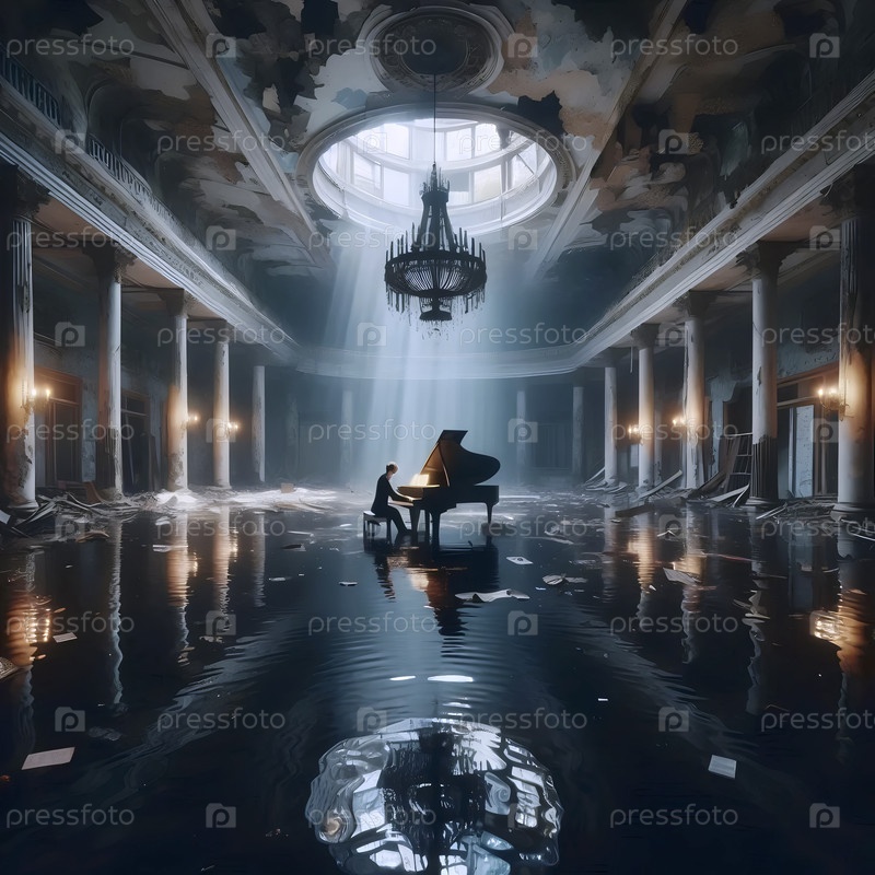 Музыкант, играющий на пианино, который наполовину погружен в затопленный бал-зал с украшениями, Ai generated image