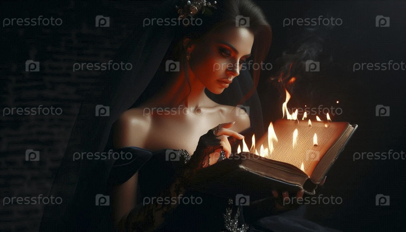 Невеста читает из горящей книги, пламя освещает ее решительное лицо
