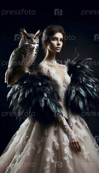 Невеста в пернатом плаще с большой рогатой совой, сидящей на ее плече, Ай создала изображение