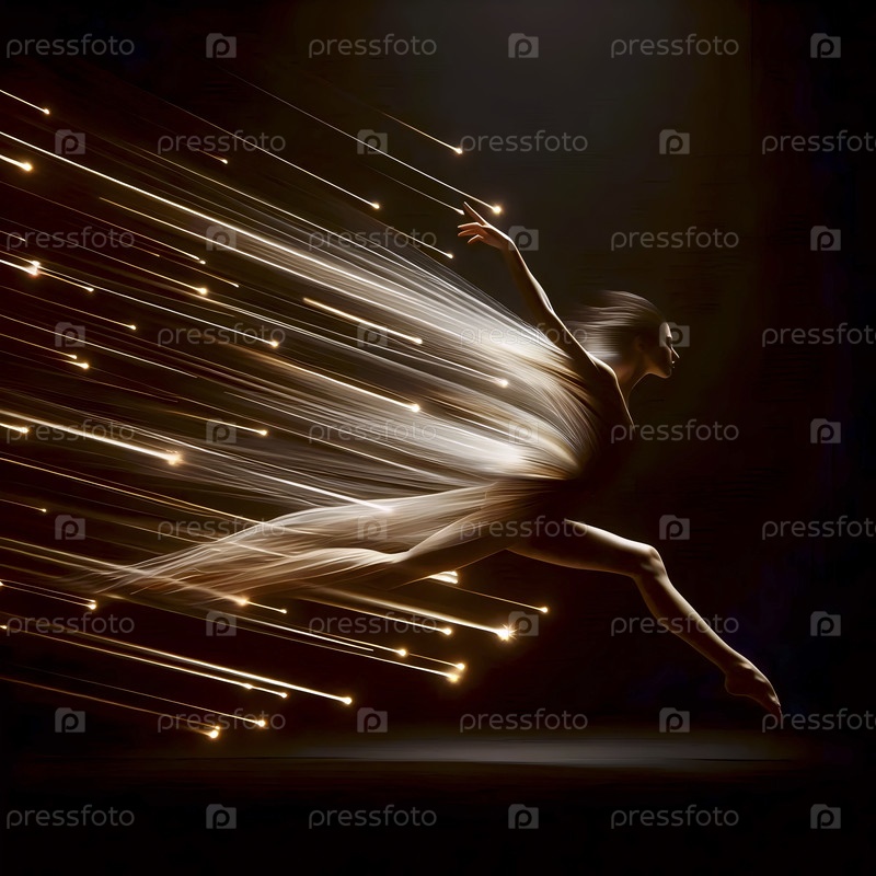 Танцовщица прыгает горизонтально через чистую черную пустоту, тело освещается как комета, Ai generated image