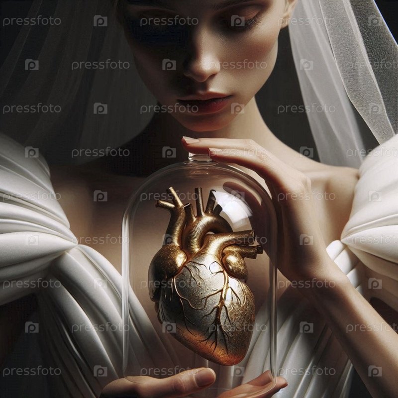 Невеста держит человеческое сердце в стеклянной колокольни как редкий образец, Ai generated image